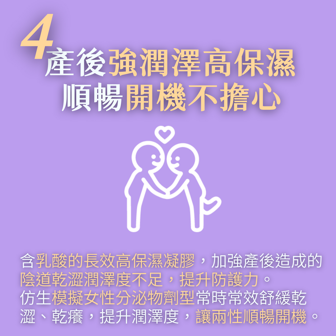 產後造成的陰道乾澀潤澤度不足,務必要以含乳酸的長效高保濕凝膠保養,乳酸可以調控健康環境提升產後防護力,仿生模擬女性分泌物劑型可以更常時常效舒緩乾澀、乾癢,補充潤澤度潤滑兩性順暢開機。