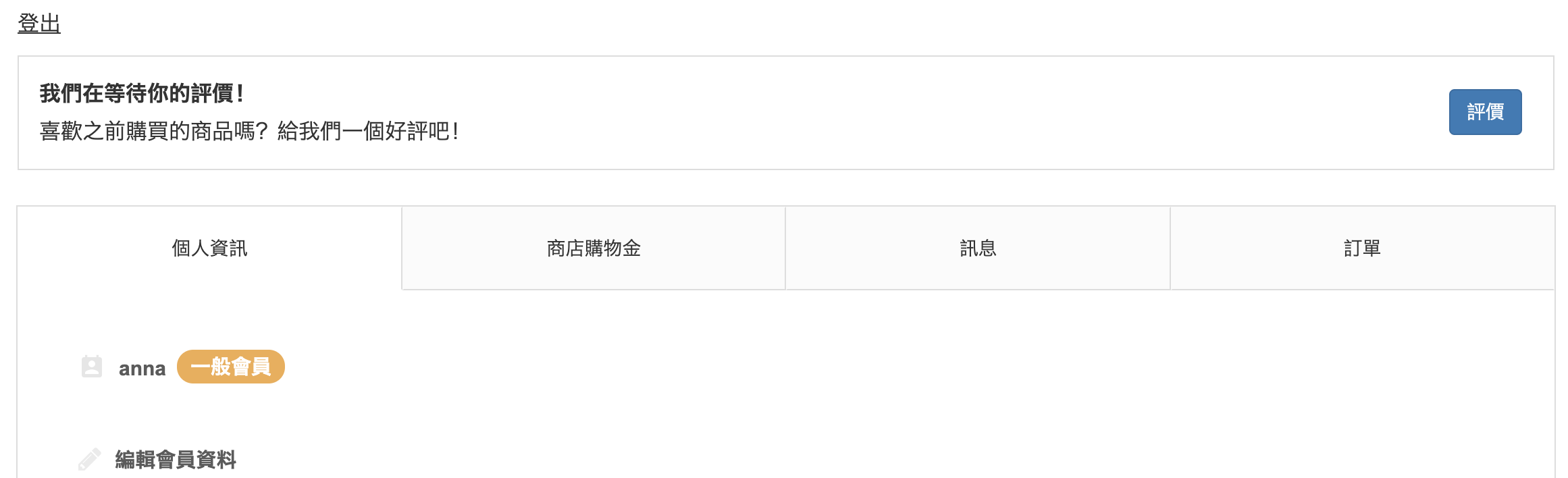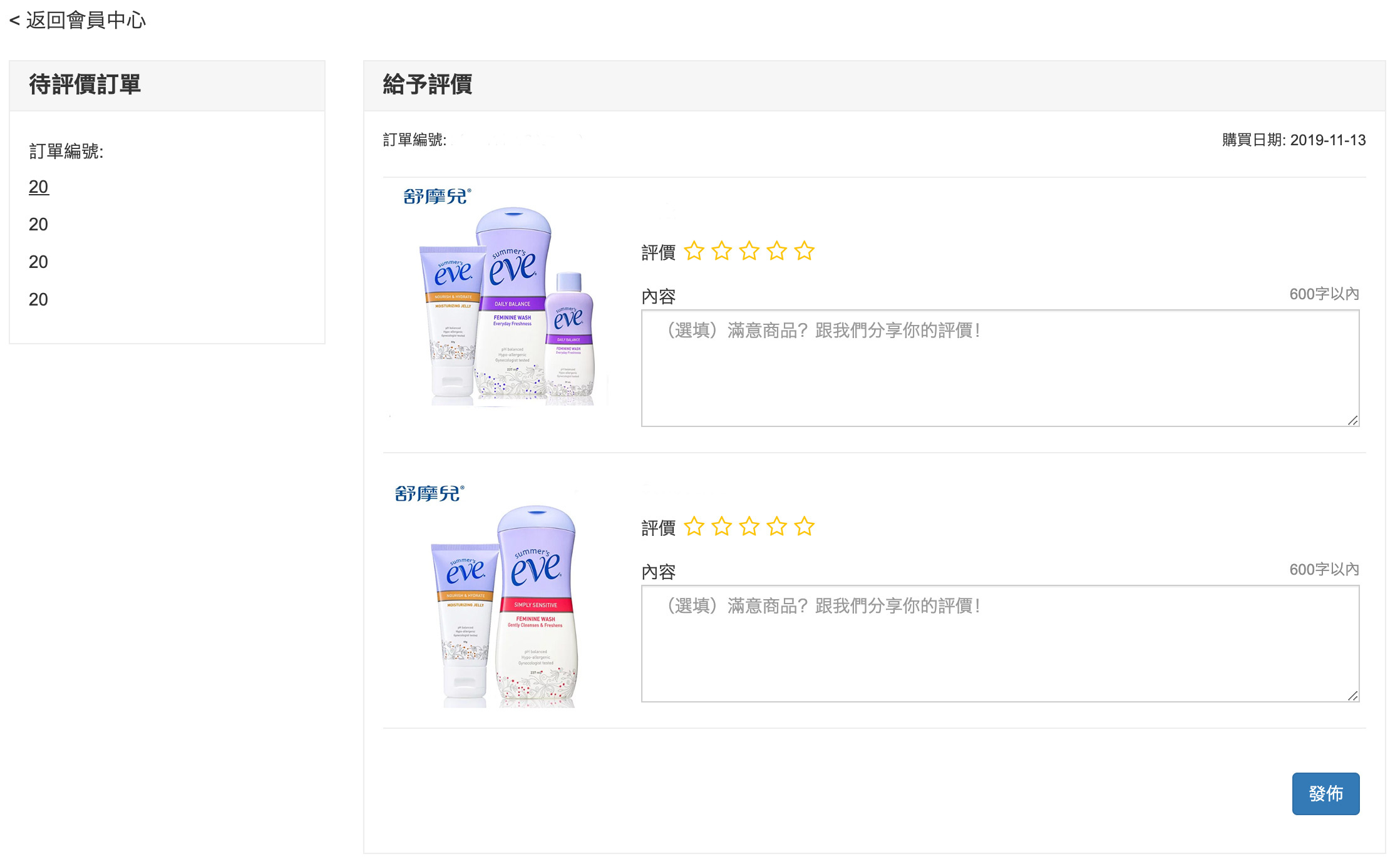 登入會員購買並完成訂單後,即可在會員中心頁面點選評價按鈕。