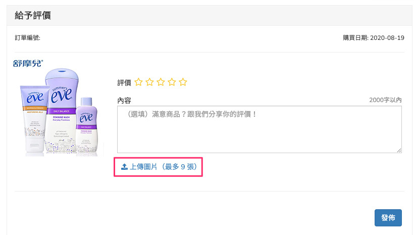 您也可以在此步驟上傳圖片,每個商品最多上傳 9 張評價圖片。